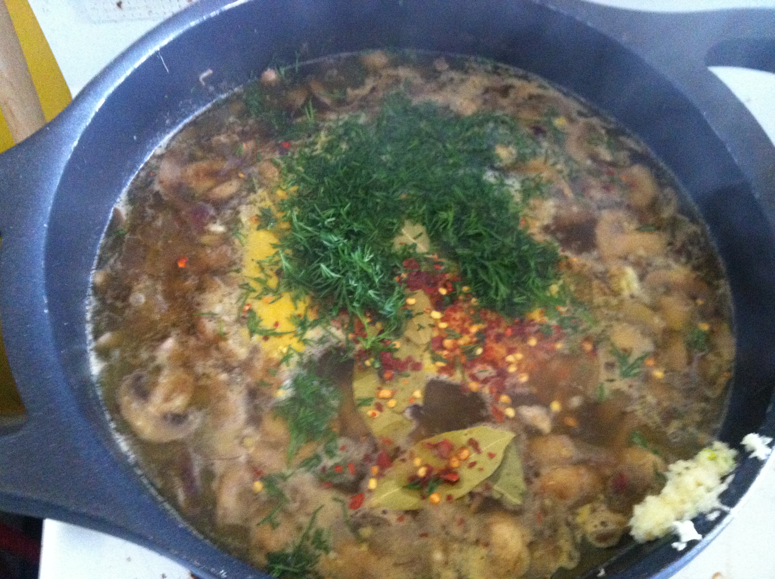 Sautee all the mushrooms until they release liquid and brown a bit. Throw in the onion and sautee it a bit. Stir in barley until coated in oil, then add hot broth and water. Bring to a boil. Add bay leaf, garlic, chili flakes, balsamic and then simmer soup until barley is cooked. Add nutritional yeast, dill and black pepper. Eat.