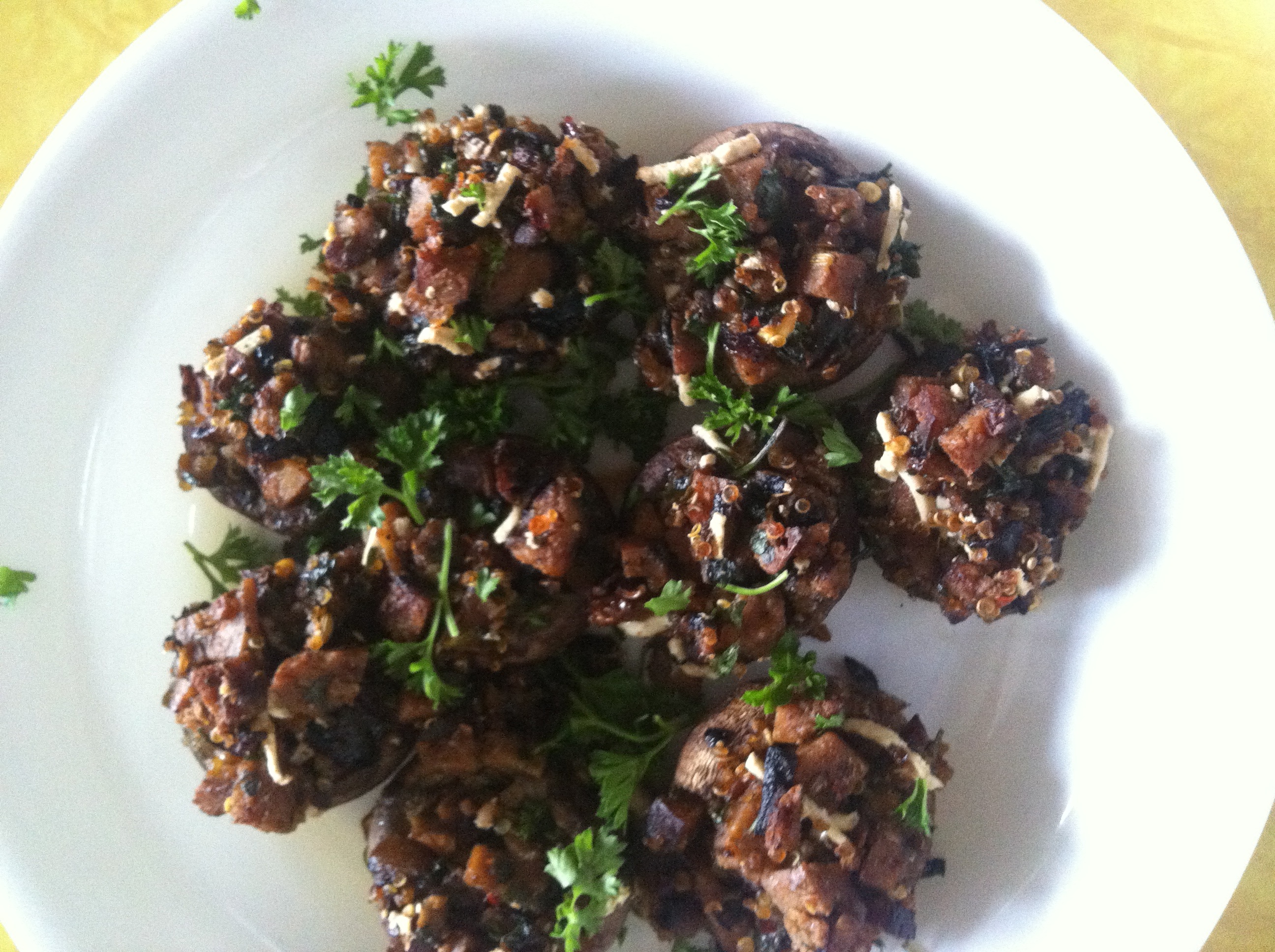 Sautee onion until quite soft and caramelized. Add half of the mushrooms stems, chopped small and cook until they release their liquid. Add sausage, cook briefly just so they start to brown. Add parsley, spices and garlic. Stir in quinoa and nutritional yeast. Set aside.