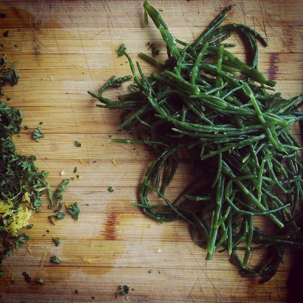 so i tried to cook sea asparagus! it is very salty so i soaked in it 2 changes of ice water for a while. this is to get some of the saltiness out and to rinse out all the sand. then it’s time to trim the ends and any icky bits, trim off anything yellowy green (older), keep the jadey green parts. it gets a bit woody as it gets old. then i blanched it. that is the prep.