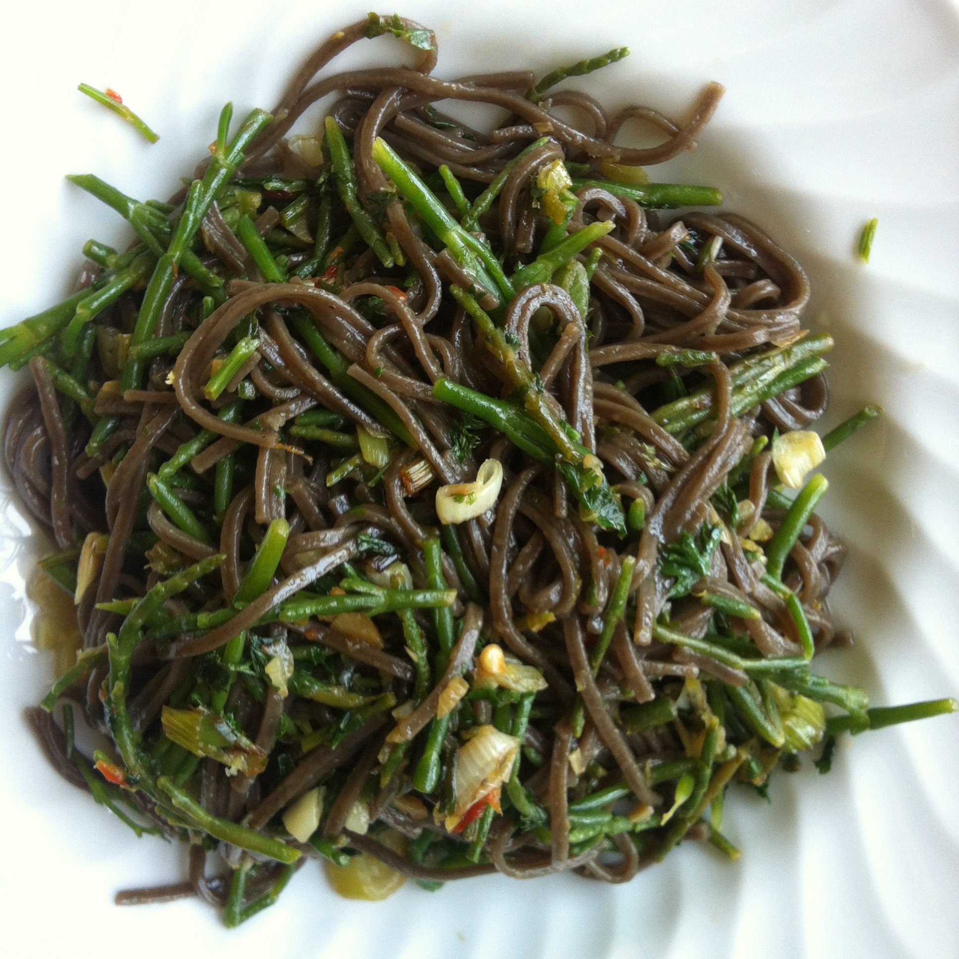 sautee the onions and garlic for a minute, then toss in the blanched sea asparagus. cook the soba, strain it and toss into the pan. heat through with all remaning ingredients and serve immediately.