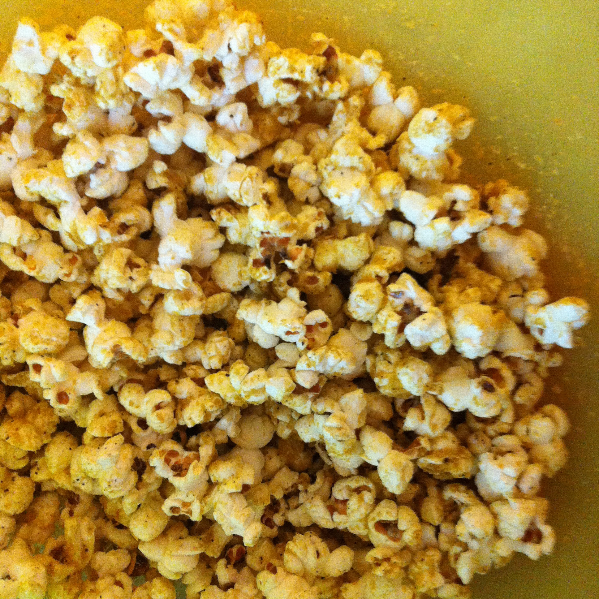 heat up a heaping tbsp of coconut oil in a pot, and put in 3 kernels and put a lid on it. turn to medium heat and wait until you start to hear popping, then add a layer of kernels (it always makes more than you think it will, seemingly). Put to lid on and shake the pot around until the popping slows down. Toss in a bowl with olive oil, a big handful of nutritional yeast, a couple tsp of curry powder, one or two big pinches of salt, and lots of black pepper. keep drizzling oil and tossing it while you sprinkle the dry stuff. ALL DONE.