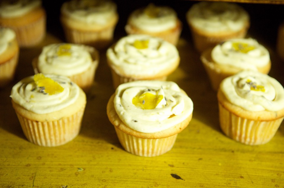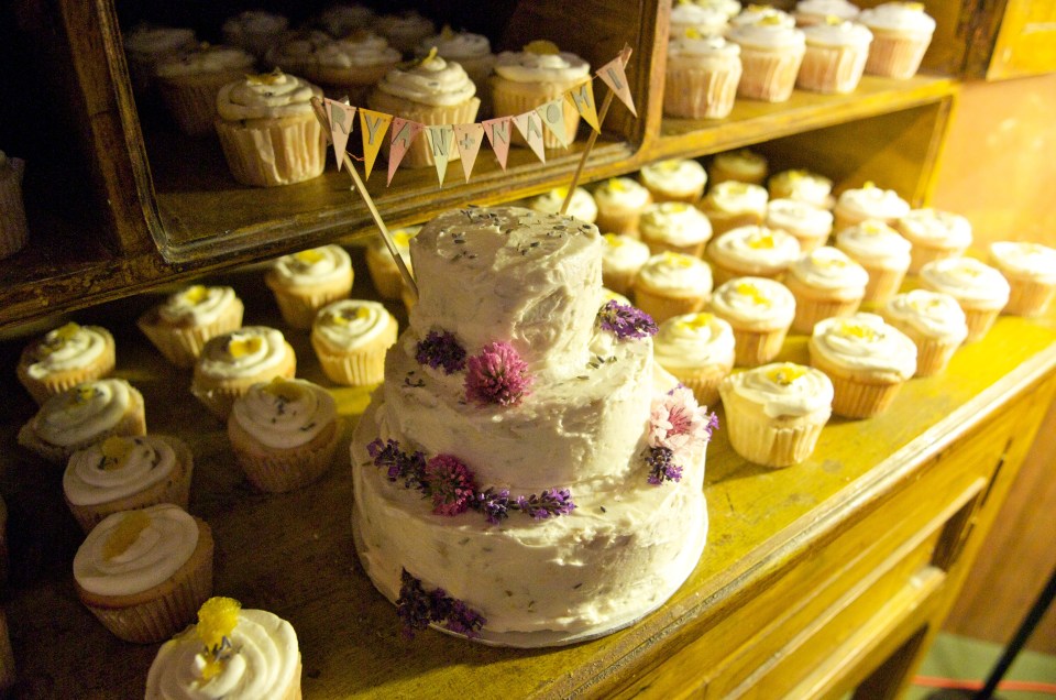 this was a lemon lavender cake, a mini 3-tiered and then 125 cupcakes. topped with lavender flowers and candied lemon peel