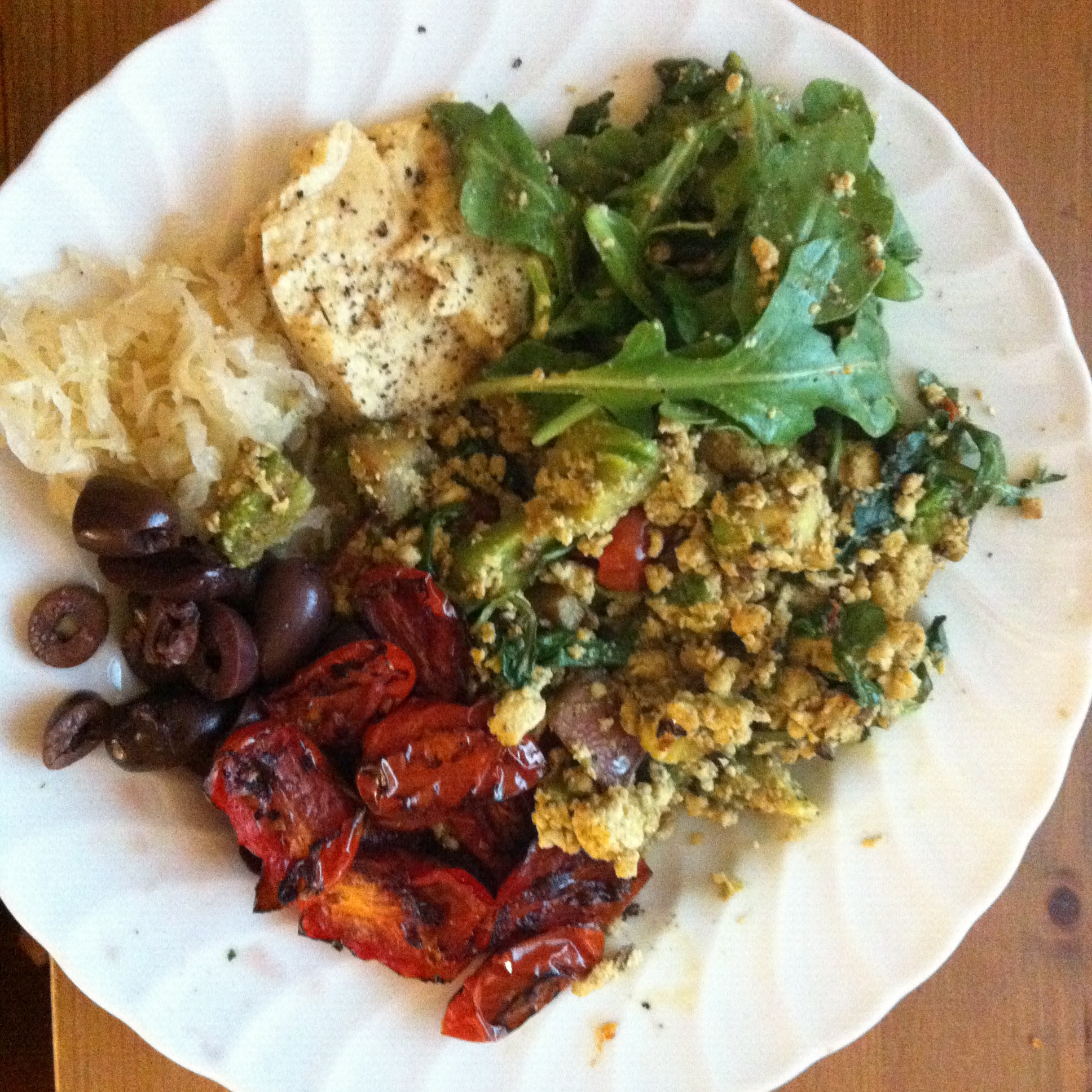 scramble with avocado, roasted cherry tomatoes, sauerkraut, hummus, black olives, arugula salad. TASTY.