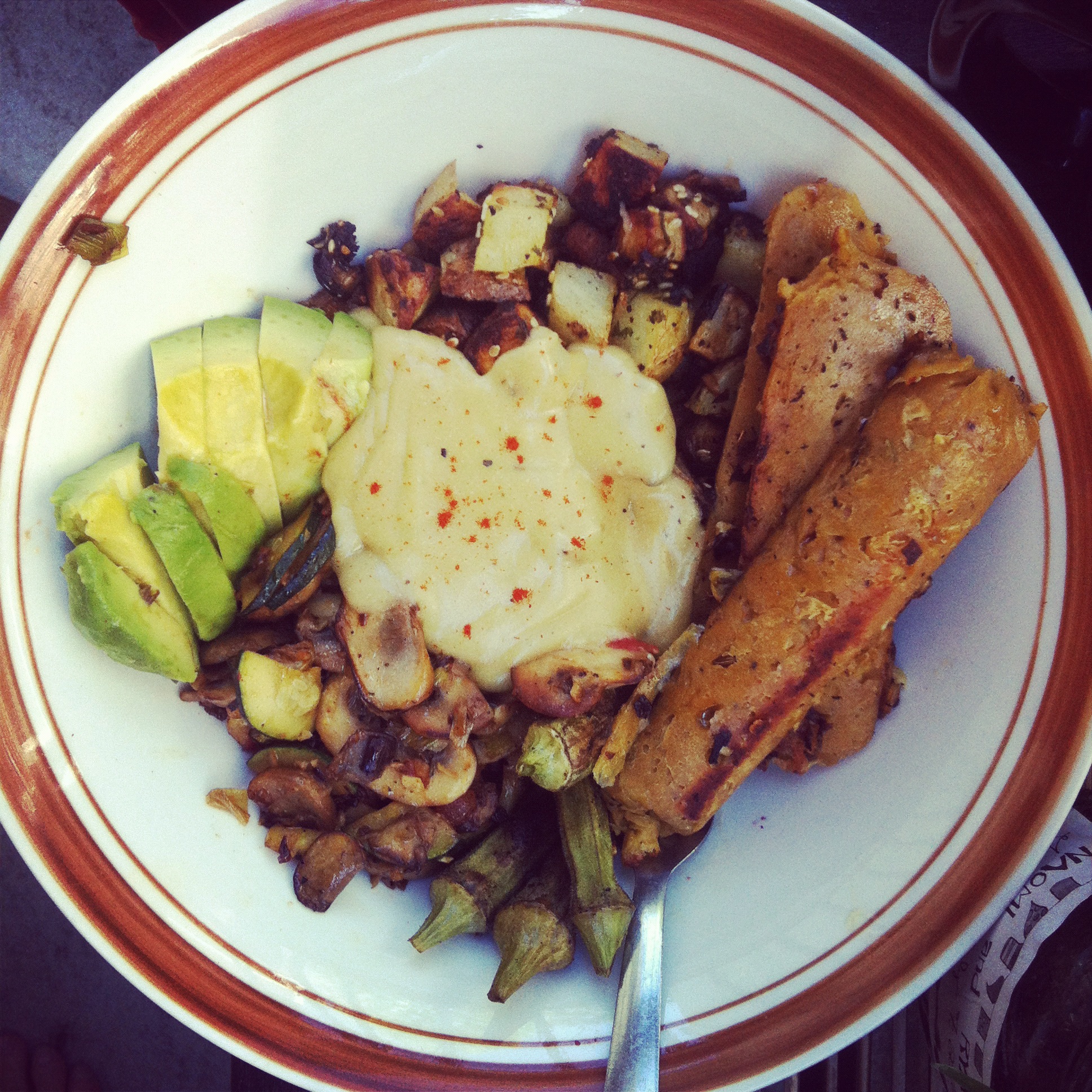 this one is pretty straightforward. sautee the onion in some oil, throw in a pinch of salt and cook low-ish so they get really nice and browned. toss in the mushrooms and cook until browned also. then the zucchini, tomato, chili paste and garlic. sautee until the zucchini is just tender. season and sprinkle with nutritional yeast.