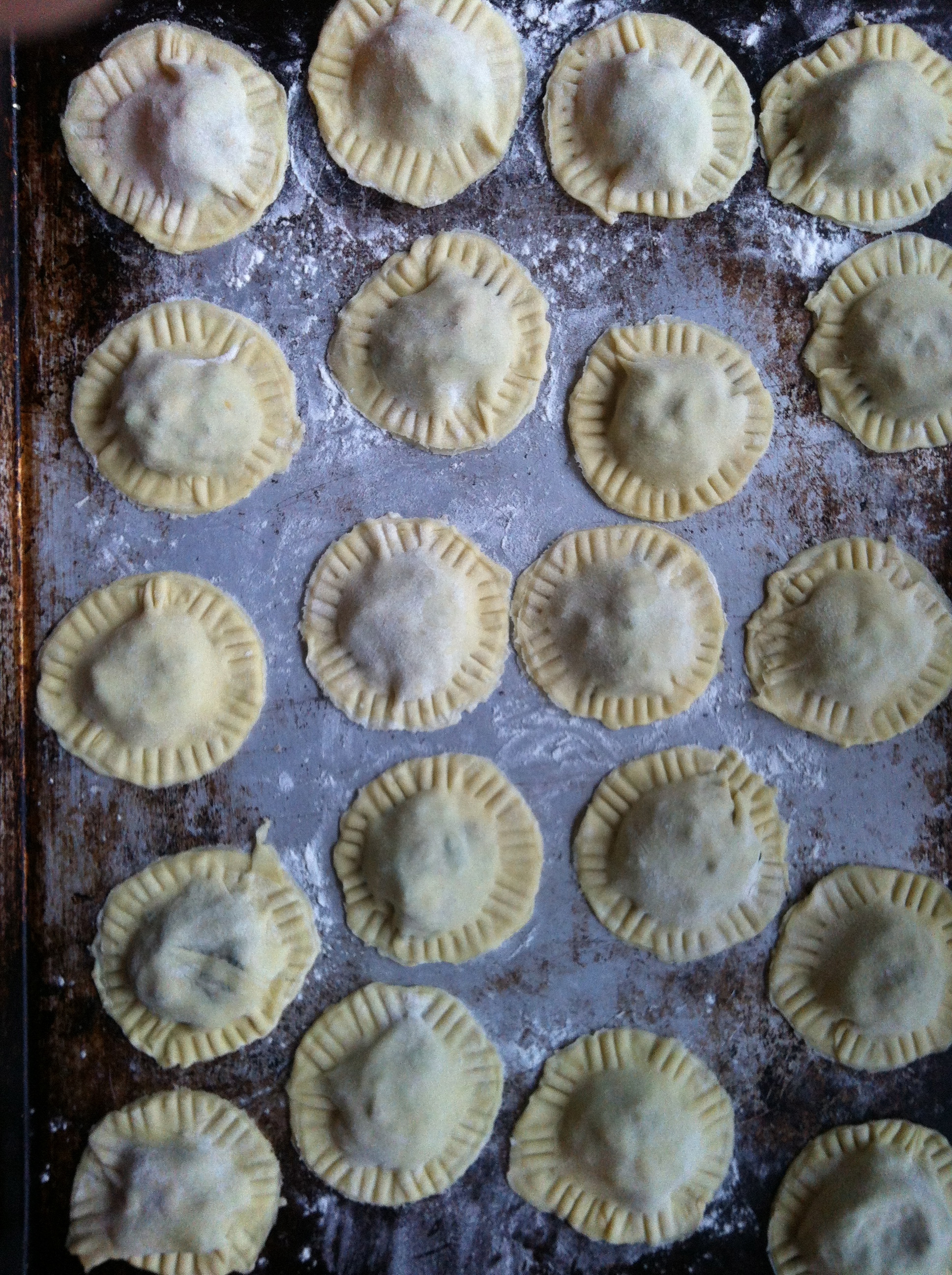 once you have your circles spoon the filling into the centre of half of them, making sure not to have any of the edges (they won’t seal if they’re greasy or have food in the way). brush the edges all the way around with water and then top them with the other half of your circles, pressing down the edges gently. brush with more water if needed. then use a fork and go around the edges to make sure they’re sealed (and it looks nice). put them aside on a floured board or baking pan*. gather remaining dough and roll out again. then repeat with your 2 reserved dough balls.