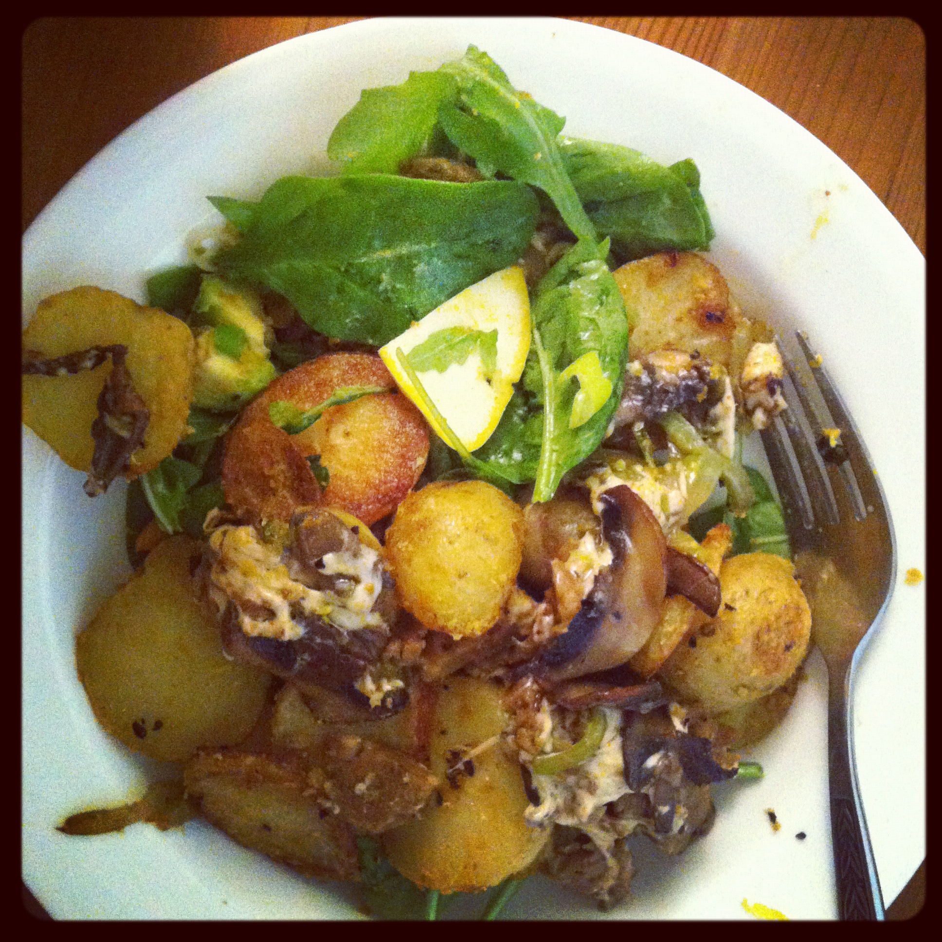 put down a generous pile of salad, top with some potato slices, then top with the hot mushroom/sausage/green tomato.