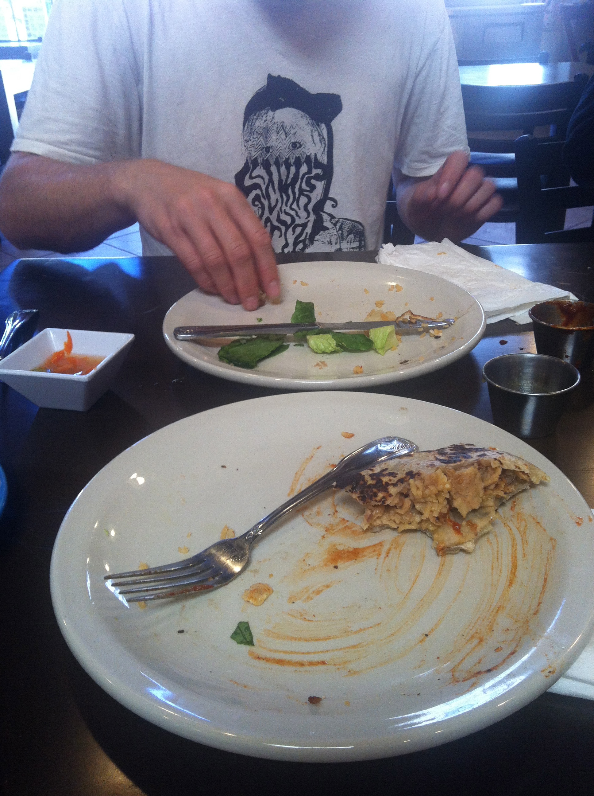 we got in one quick burrito meal before we left. we split a burrito with rice, beans, soycurls, avocado and veggies and another burrito with most of those same fillings but with chile relleno in the middle. it was good and filling. here are the remains: