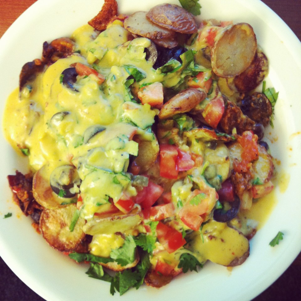 put the bean/mushroom/sausage on a big plate, then the roasted potatoes. then put on all remaining toppings and pour cheese sauce over top. ALL DONE GO EAT IT. lazy time!!!!