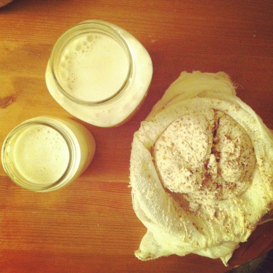 once your almonds are all soaked and rinsed, put everything in a blender until it’s smushed up really well. then pour the mix through a few thicknesses of cheese cloth until you’ve separated the milk from the almond meal. ALL DONE.