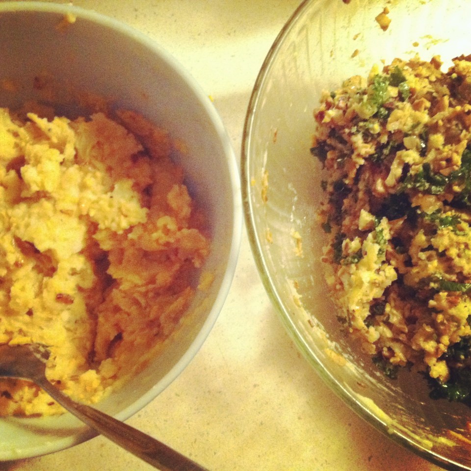 mash potatoes with onion, garlic, margarine, milk, daiya, salt and pepper. take out 1/3 of potato mixture and transfer to another bowl. in this 2nd bowl, add mushrooms and chopped kale, stirring well. now you have your two fillings.