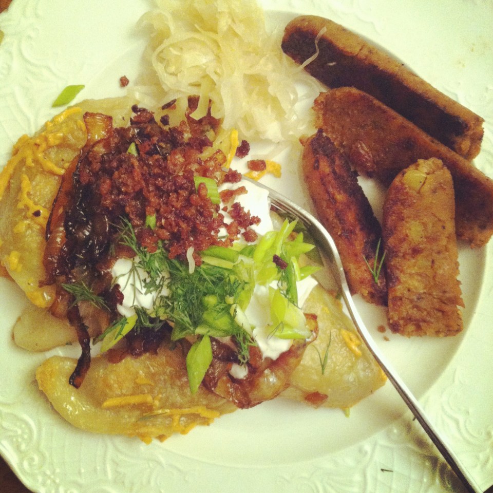 saute until browned on both sides and serve hot with sauerkraut, caramelized onions, chopped scallions and whatever kind of sour cream substitute you like!