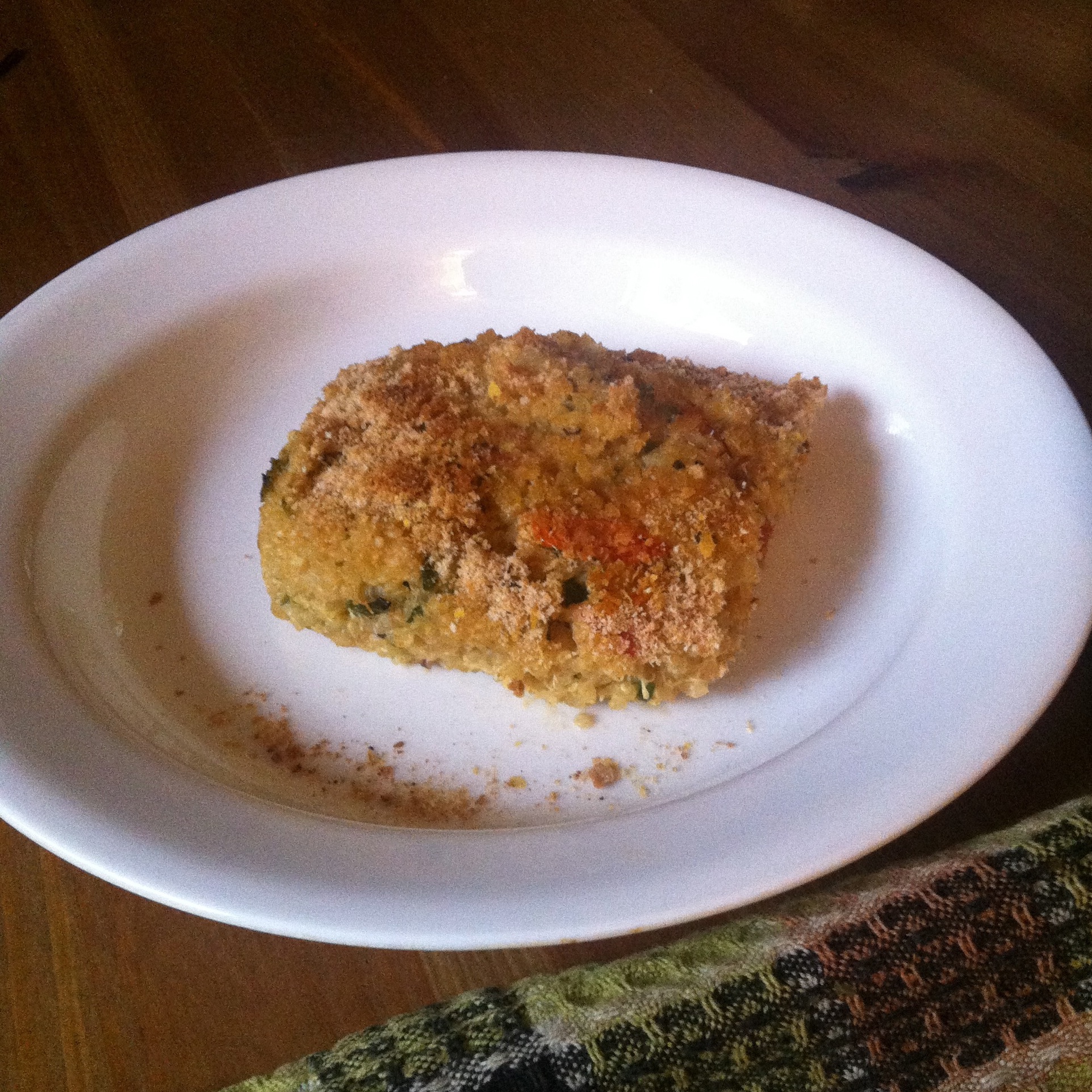 cook quinoa in broth! bring to a boil then simmer with a lid for about 15 minutes until broth is absorbed. heat sauce in a small saucepan and add white wine, almond milk and chili paste. stir everything together (except crumb topping). spread into an oiled casserole dish. mix crumb topping and spread over top. drizzle with olive oil and bake at 375 for 20 minutes, then broil until golden.
