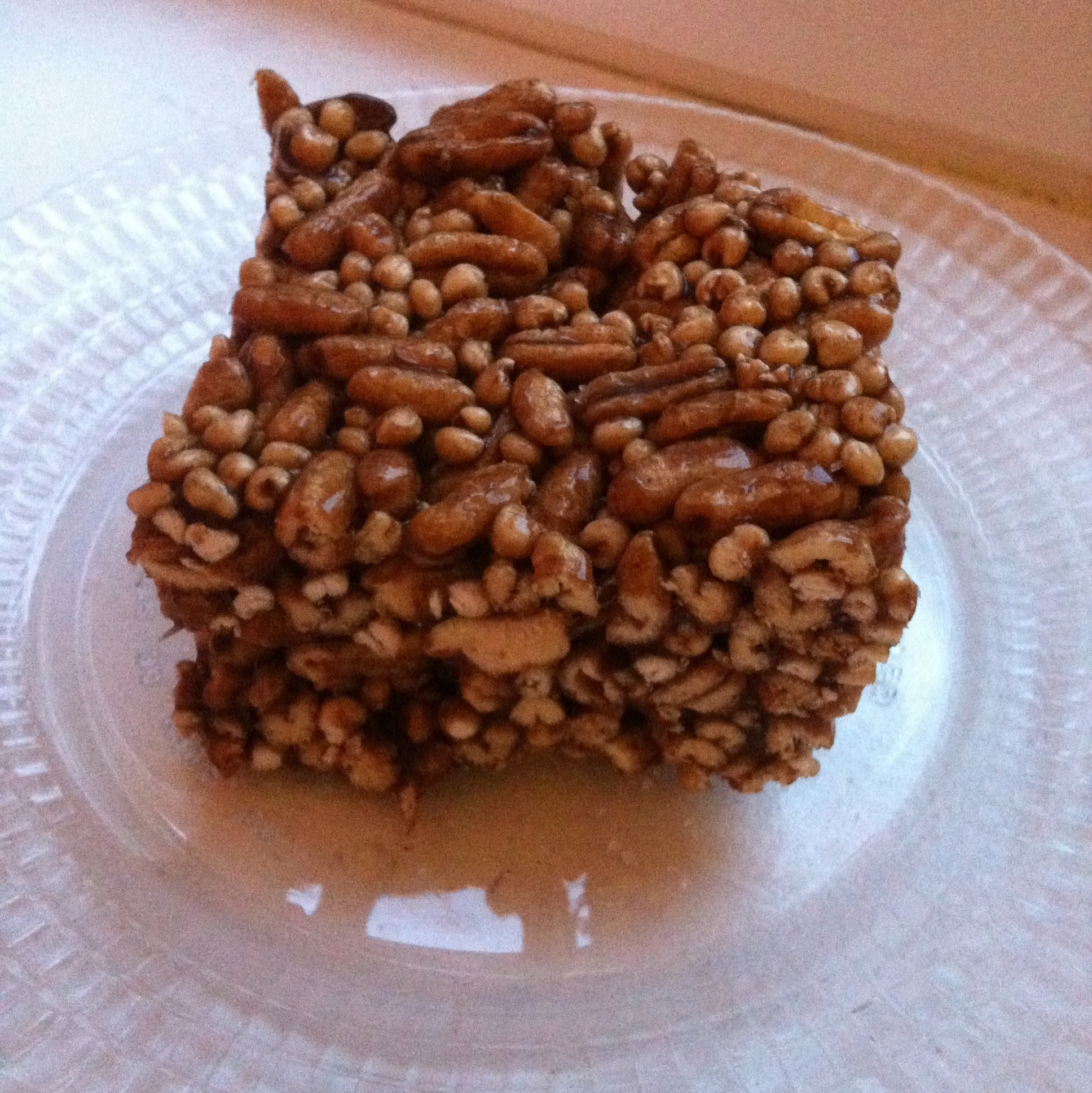 put the puffed wheat in a large bowl, and put aside. in a pot, melt margarine. then add everything else. bring to a boil and boil for FIVE MINUTES. take off heat and pour over your puffed grain. stir it really really well then spread into an oiled 12×8 inch casserole style dish. press down evenly. let cool and solidify. THAT’S IT!