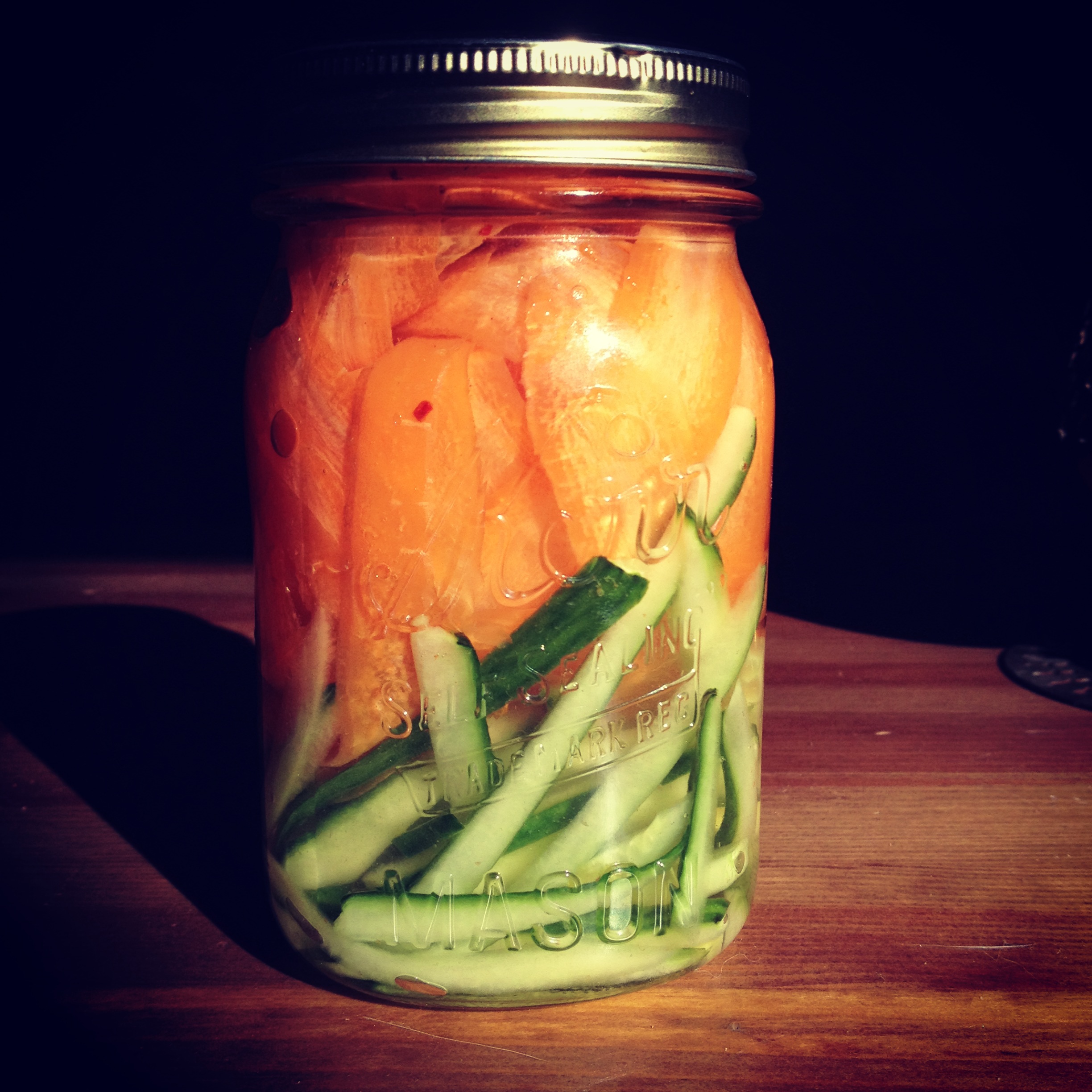 combine water, vinegar and sugar and dissolve sugar. add chili flakes and salt. put all the veg in a 500mL jar and pour over vinegar mixture. let sit for a couple hours at least! tasty delicious.