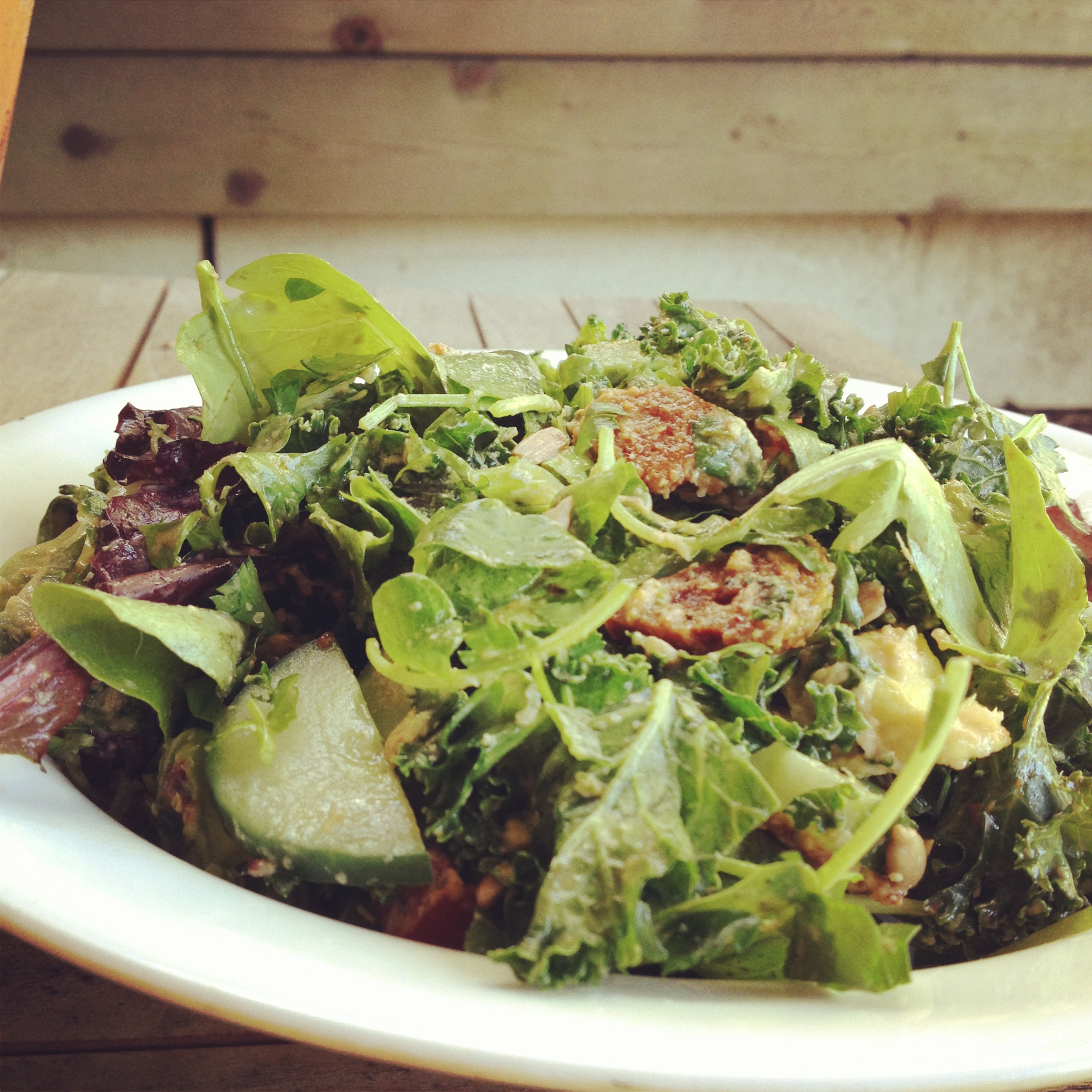 sautee broccoli in coconut oil with a pinch of salt until slightly browned and it just turns bright green. put aside in a bowl. in the same pan, brown sausage, adding more coconut oil if needed. cool sightly and add to salad.