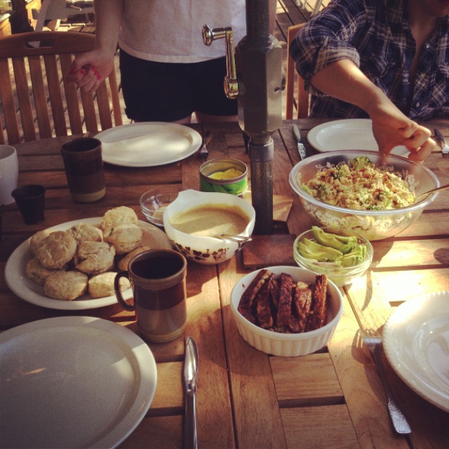 i was lucky enough to go a friend’s cabin and spend the entire time either eating or floating in a lake. this is one of the meals i cooked up while there: broccoli tofu scramb, gravy, avocado, biscuits and tempeh bacon!