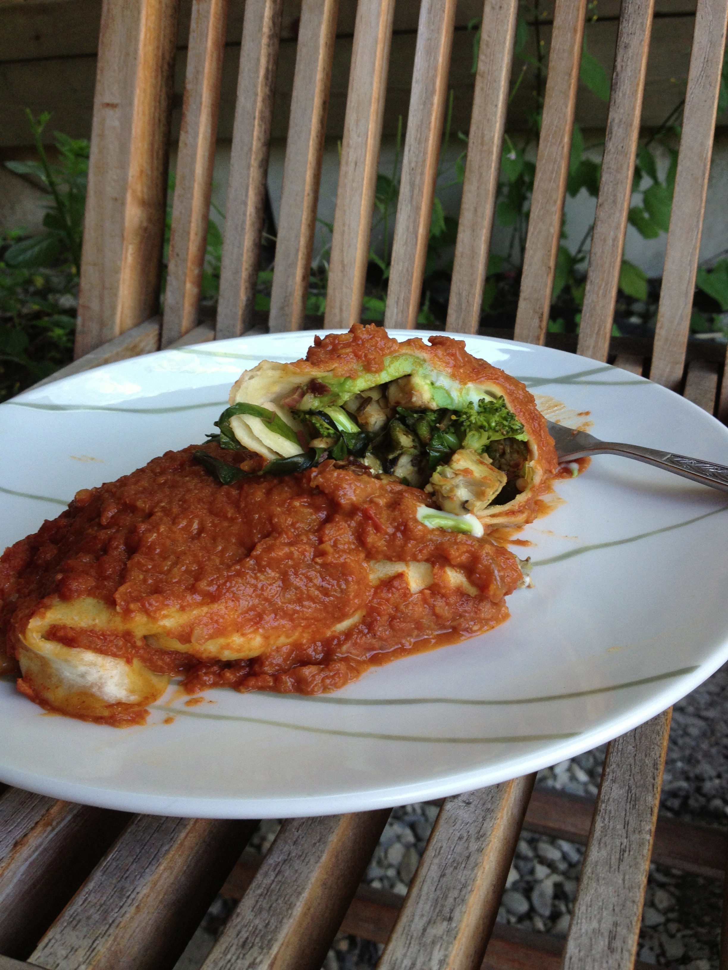 preheat oven to 350. fill 3 tortillas with the okra broccoli chard mixture, tempeh and daiya. wrap and place in pan side by side. pour sauce overtop, bake for 15-20 minutes.