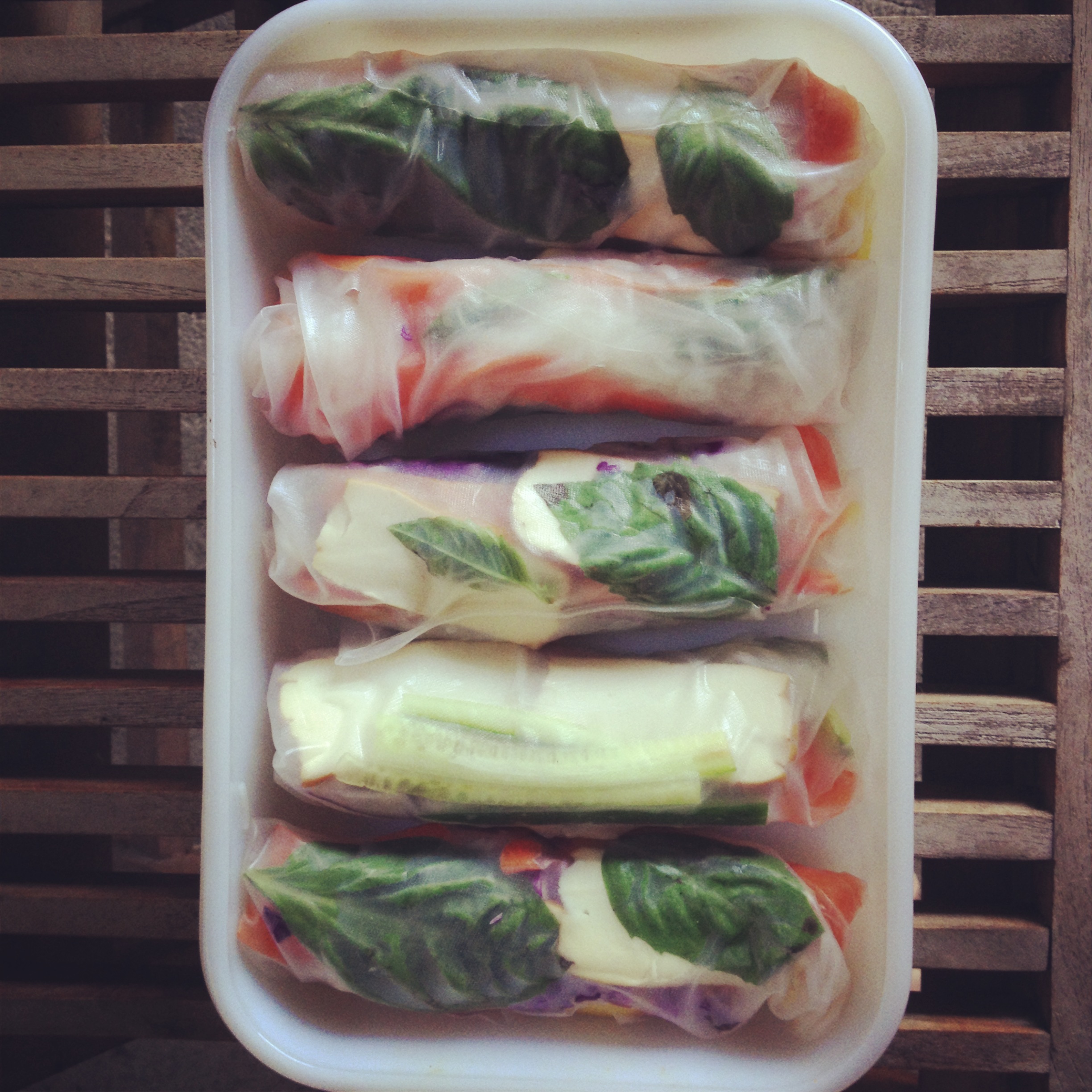 Soften wrappers in a large shallow dish or warm water, one at a time as you’re making the rolls. lay it on a plate, put basil leaves down the centre then fill with other ingredients as you like. leave a bit of space at each end and quite a bit on either side. fold the shorter ends in the roll to seal, you want them pretty tight but you don’t want the paper to tear. repeat with remaining ingredients!