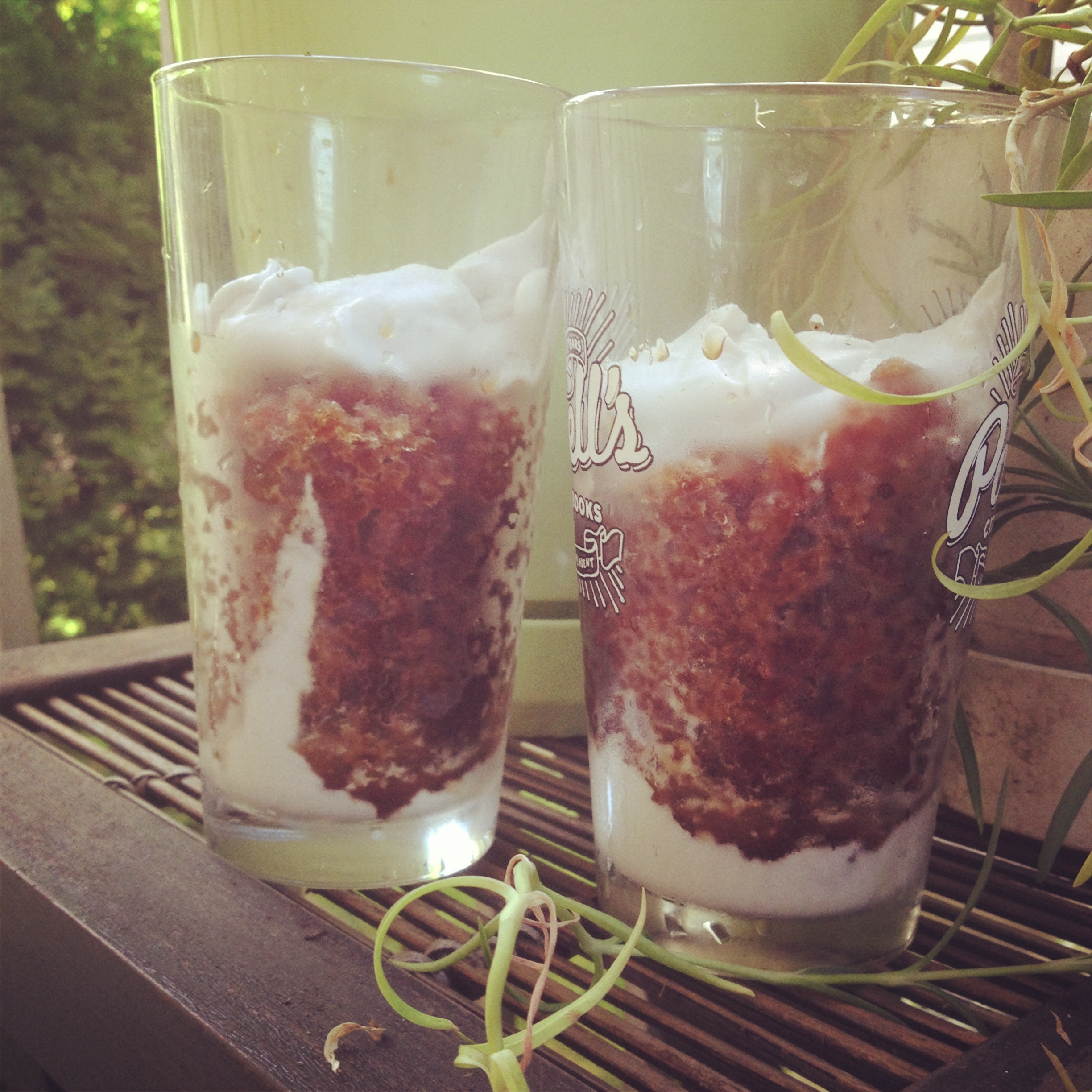 this if from a recipe i found over at smitten kitchen, and changed to suit my needs ever so slightly. here’s how i made it: 1 c. espresso (i used stovetop) 1/ t4sp good vanilla (optional) 2 tbsp sugar dissolve sugar in hot espresso, then put in the fridge to cool. once cooled, put in a shallow freezer-safe dish. freeze for an hour then scrape it up with a fork, breaking up all the ice that is starting to form. freeze for another half hour, scrape again, freeze for half an hour, scrape again then freeze for another half hour. scrape it then eat it! if it happens to be frozen enough soon then you are a lucky dog, go ahead and eat it! serve with coconut cream! i’ve also been thinking about putting hooch in this. i will keep you posted.