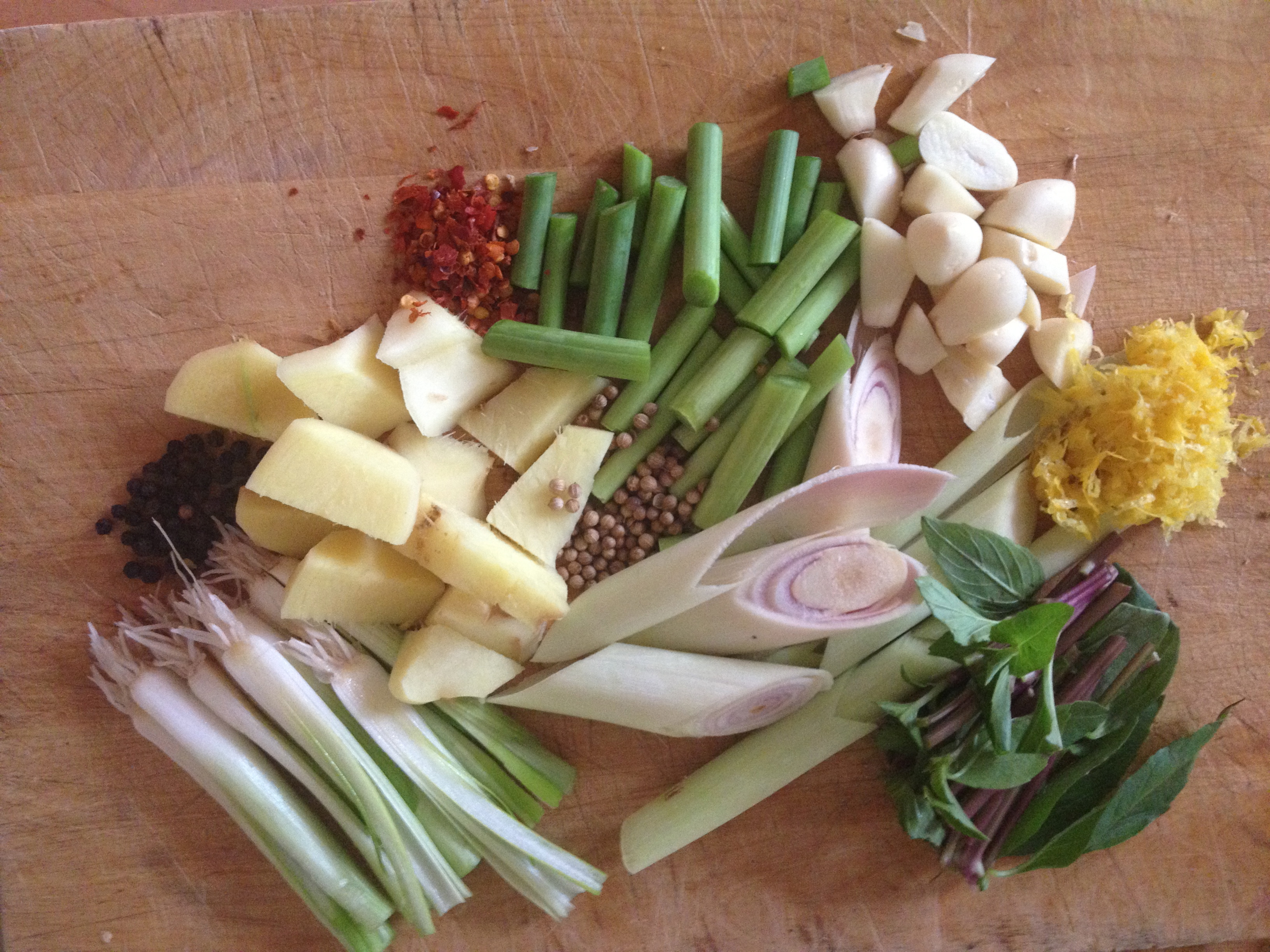 - 1 stalk lemongrass, wacked all over with the back of a big knife then chopped into big segments