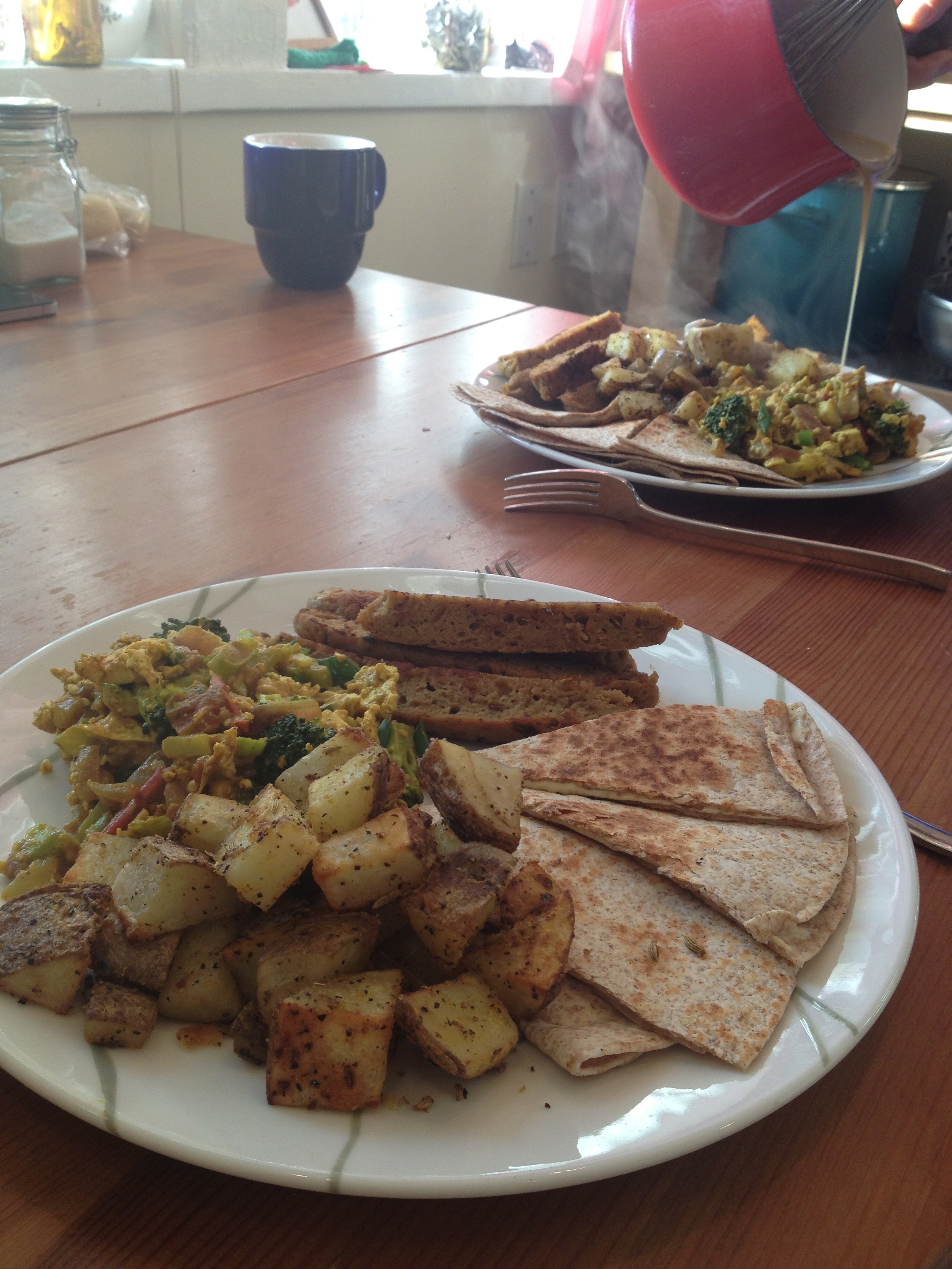 crumble the tofu and toss with spices, soy sauce and nutritional yeast. heat oil in a pan and saute onion until soft and translucent. add tofu and garlic, cook until browned. add broth and scrape up all the brown bits and cook for another minute until the broth is all absorbed. remove from heat.