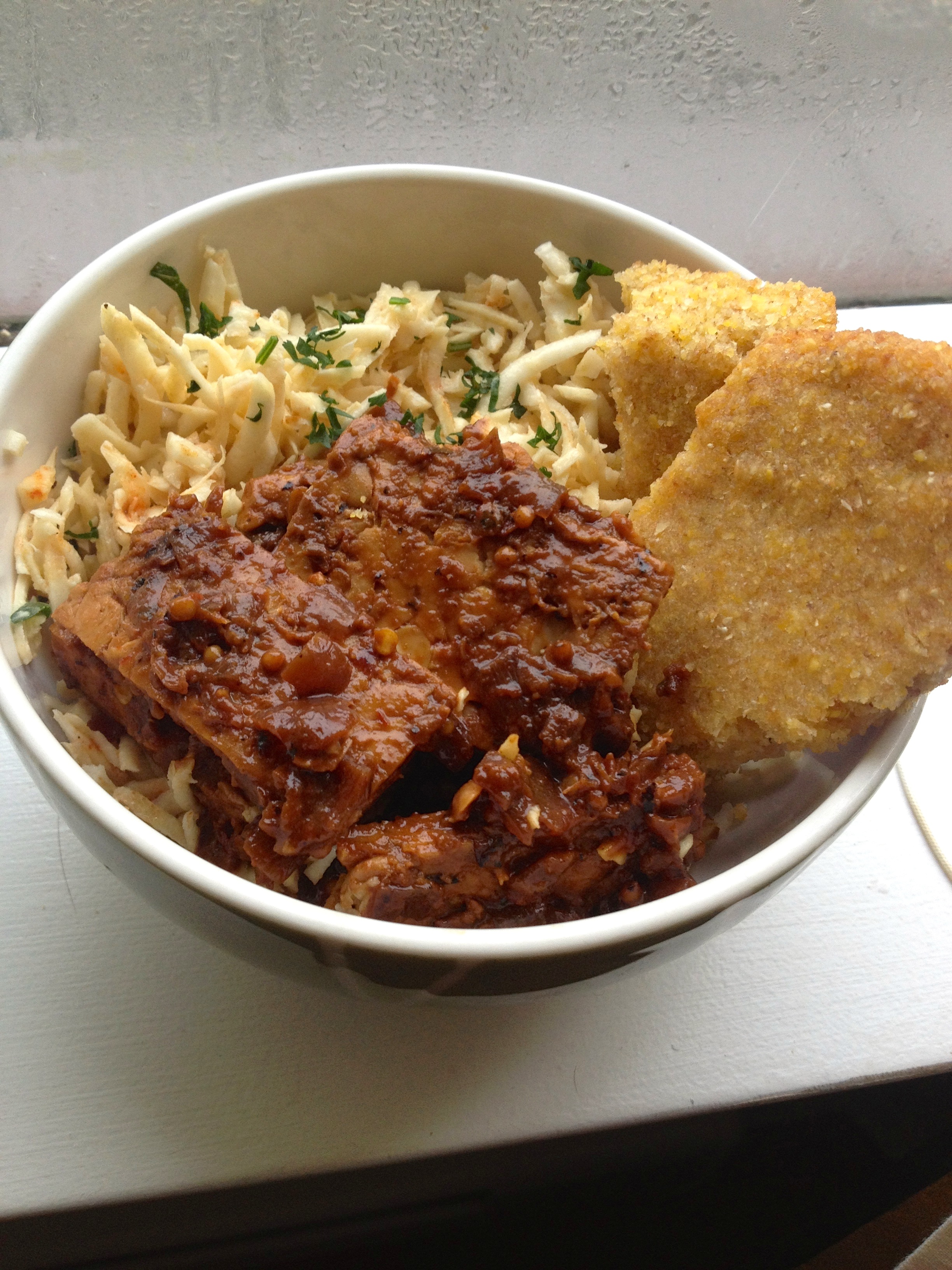 there are fewer more satisfying combinations than saucy spicy BBQness with creamy slaw and cornbread. i had leftover celeriac from the lasagne so i used it up in this slaw and it is so good raw.