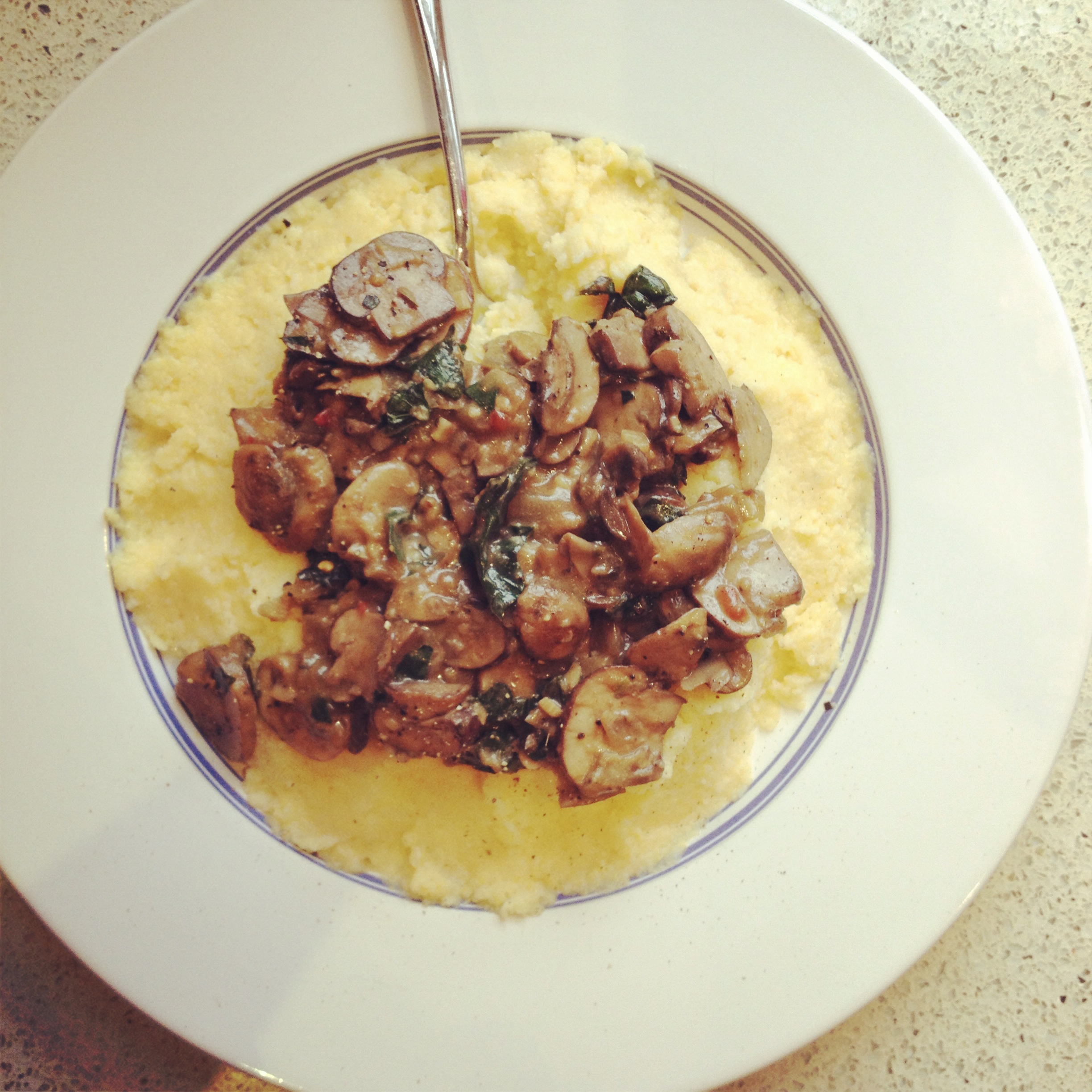 bring water and pinch of salt to a boil then whisk in cornmeal. continue whisking until it starts to thicken and sputter then bring the heat down to medium low. it’ll keep sputtering but just teeny sputters. if it’s sputtering big flying hot cornmeal burps then turn the heat lower. add a bit of almond milk as it thickens, whisk and let it chill out. add bits of milk as need be (i added probably 1/2 c. all in). it should cook for atleast half an hour but ideally up to an hour. it should be creamy and smooth, not grainy. remove from heat, add another splash of milk and the earth balance and whisk again until incorporated.