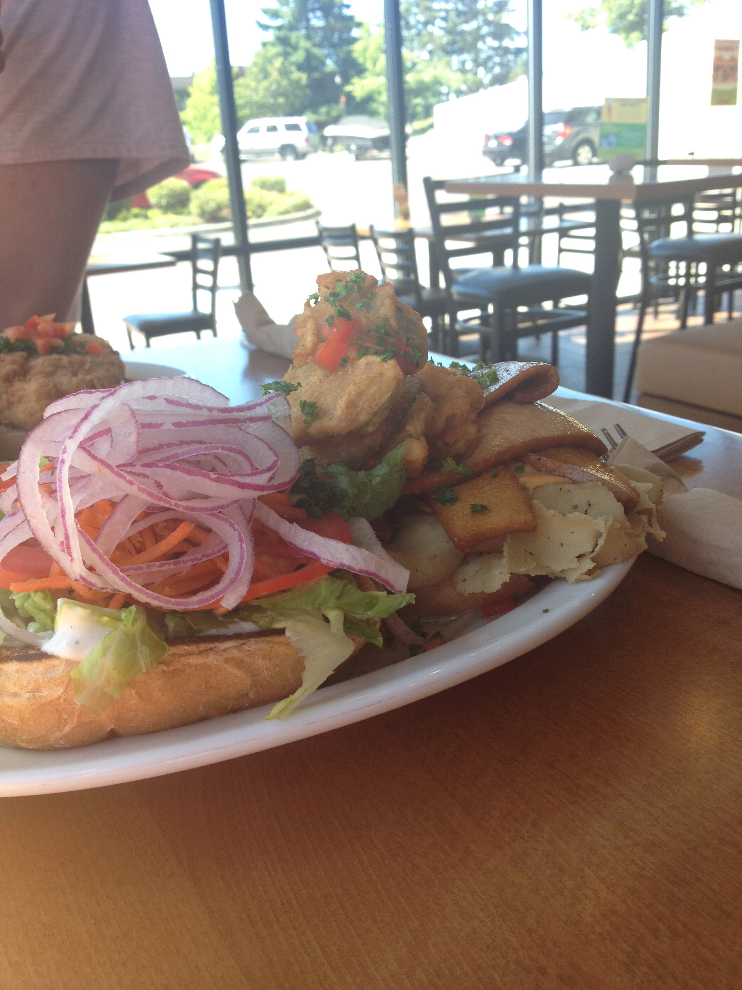 next we headed out (faaar out) to native foods to try it for the first time. i’ve always heard good things about it and so we thought we’d try it. i’m not sure how this escaped me before but it is set up like a fast food restaurant, almost exclusively located in malls in the suburbs. this was a big weird out for me (i always assumed it was a regular restaurant) but once we got over that it was tasty. we shared a crazy “bacony cheeseburger” with fried pickles and crispy chicken sandwich.