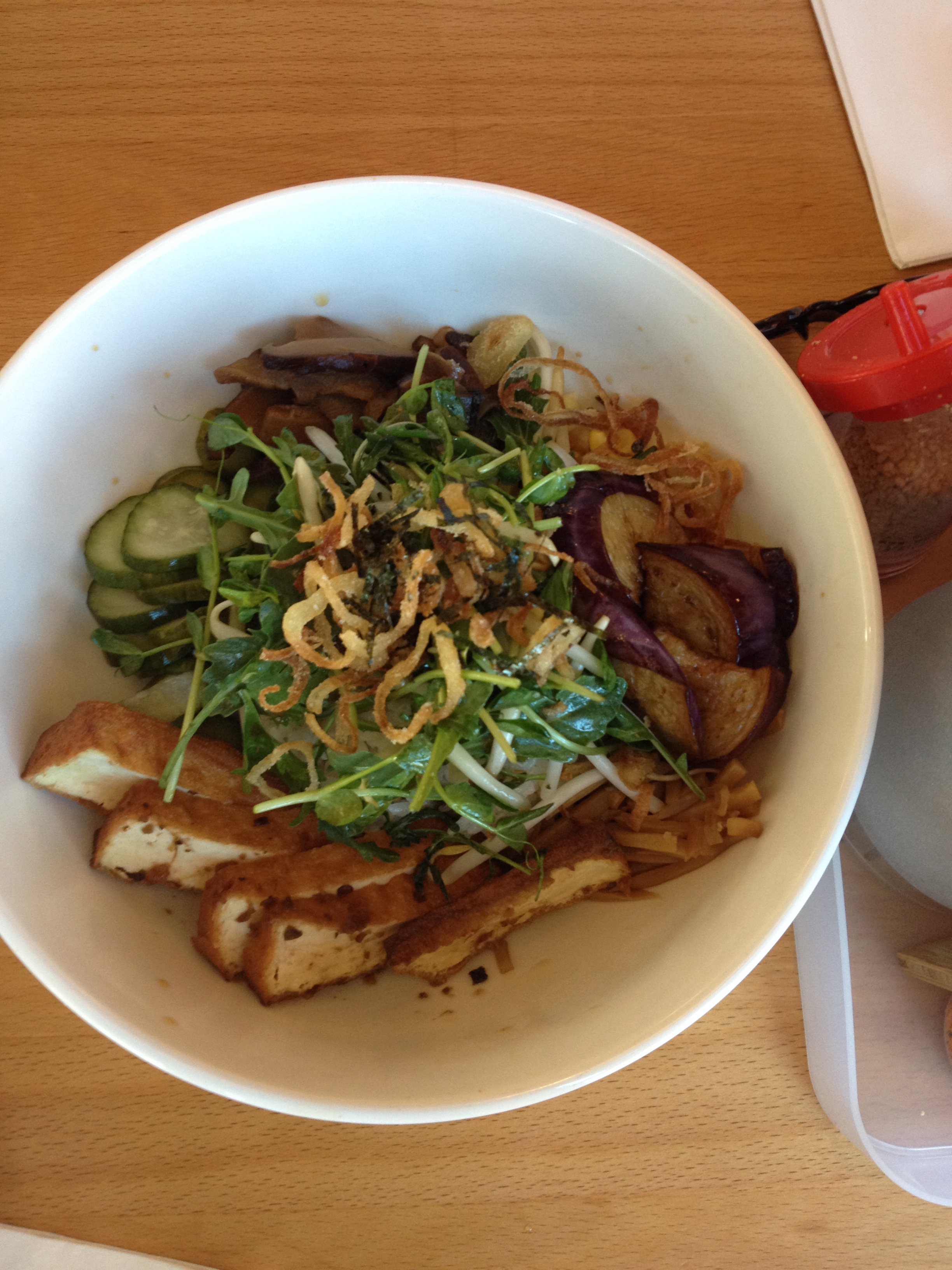 we shared two things: ramen with a carmelized fennel dashi and eggplant, and tofu rice bowl with pickles and other tasty treats (their kimchi wasn’t vegan unfortunately). delicious!