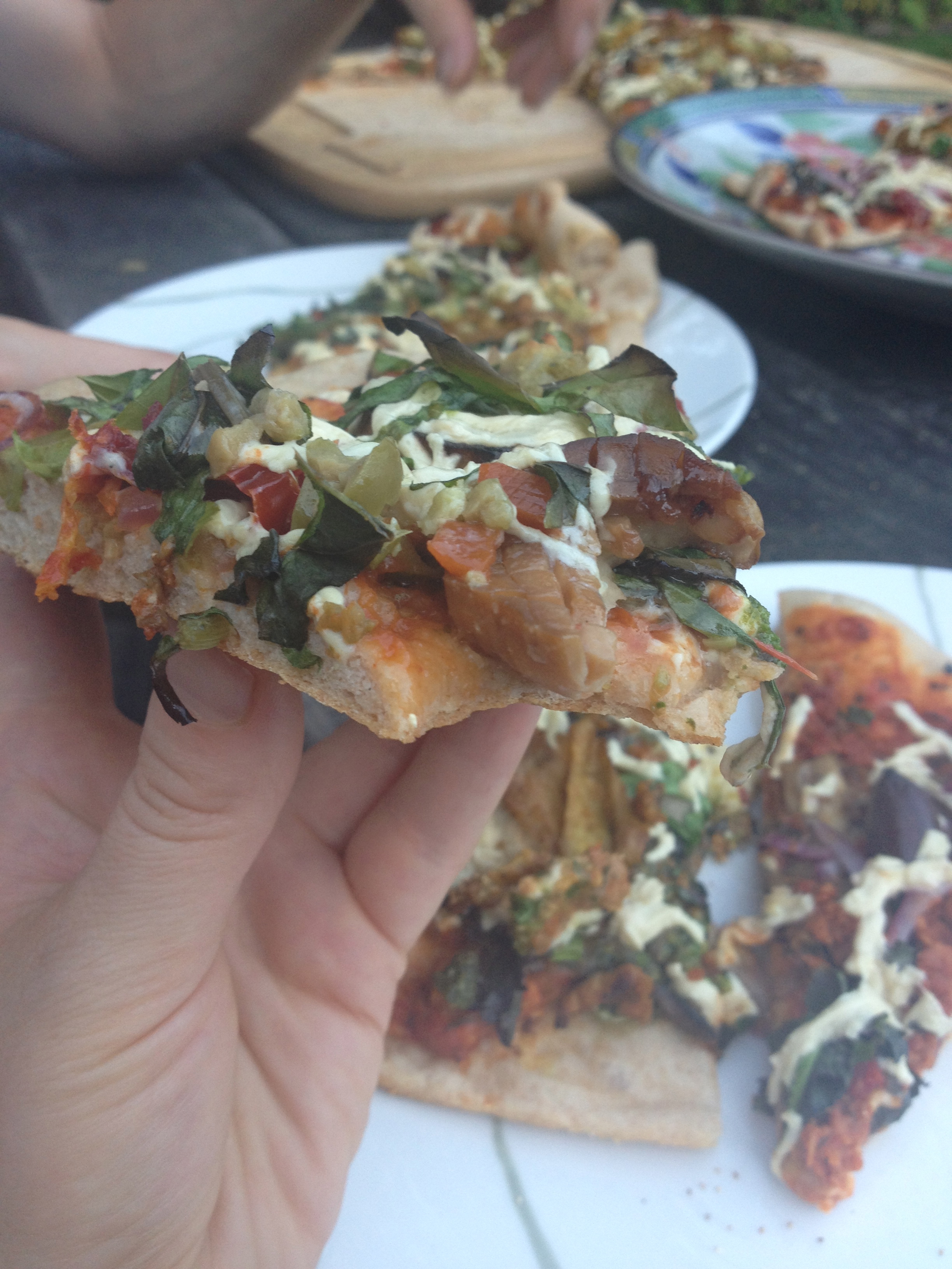 I like to dollop the pesto and ricotta on it with the tomato sauce, and i like to put the greens on at the very end so they crisp up. depending on the heat of your BBQ it may take longer or shorter but ours cooked in about 6 minutes. just keep an eye and check the bottom.