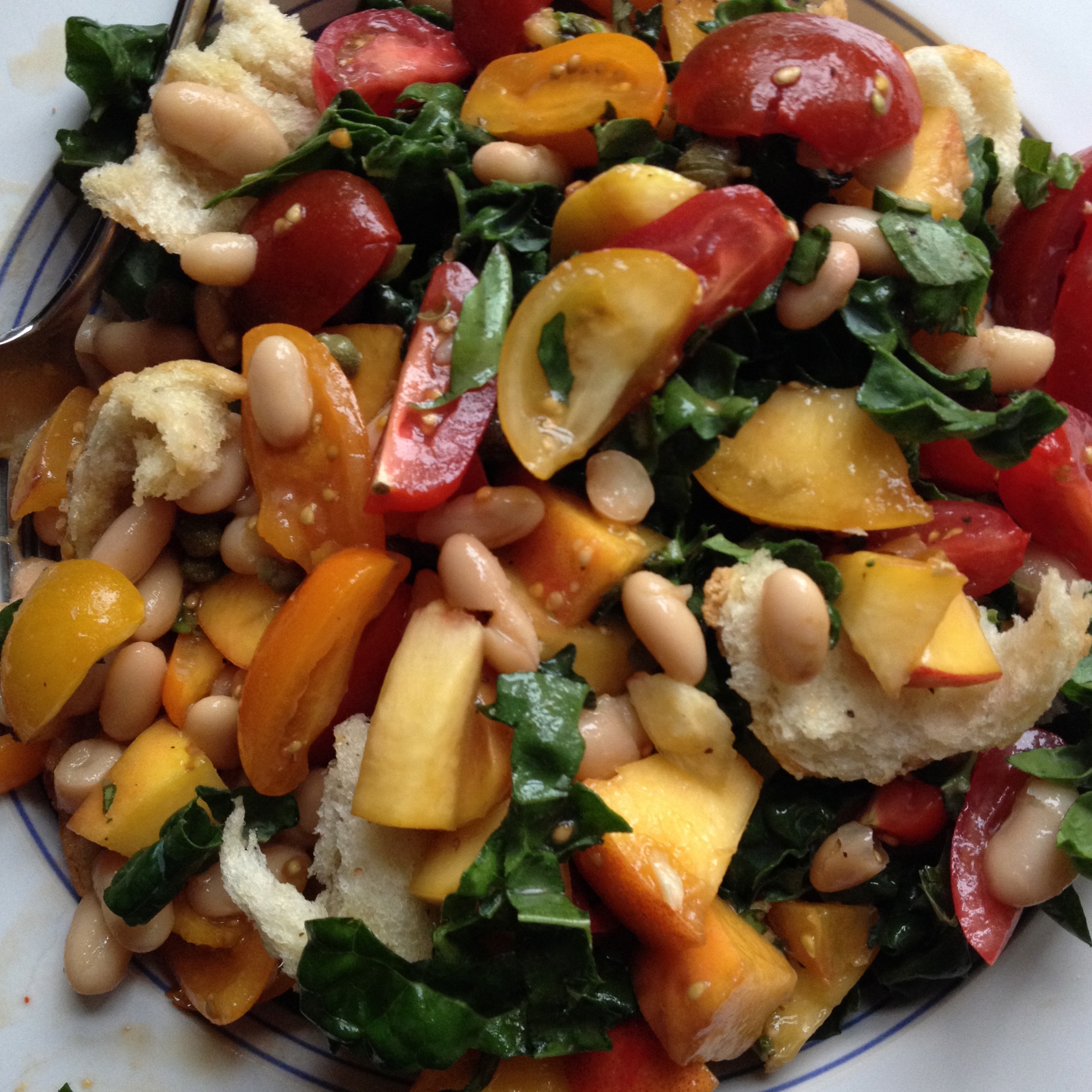 pan! za! nella! this stuff is so good, who hasn’t been looking for a reason to eat chunks of bread in their salad? this is such a nice summer salad, filling enough to be a meal with lots of flavour. this makes a salad for 2 people-ish.