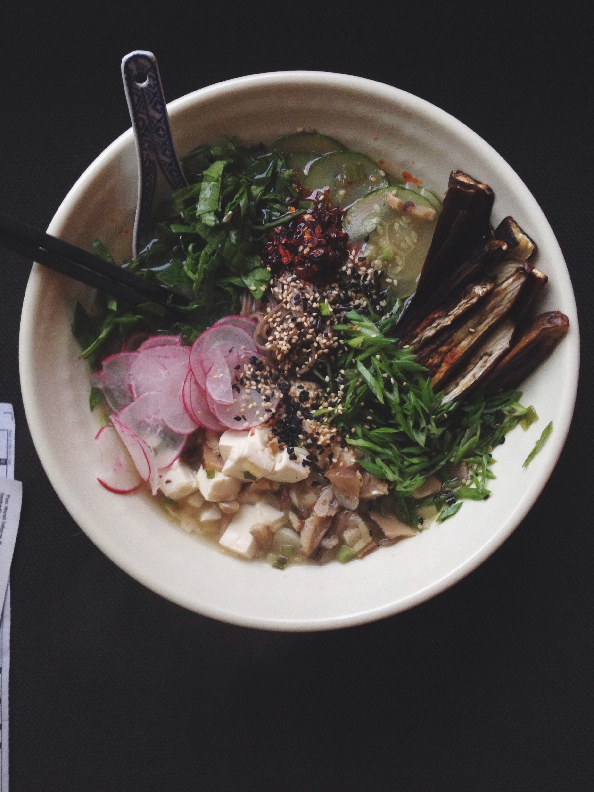 once your water pot is boiling cook the soba noodles. drain and divide between 2 bowls. pour broth between the bowls and distribute the tofu, mushrooms and zucchini. top with spinach, radish, eggplant, the green parts of the scallions and sesame seeds. put a big ol dollop of chili oil (and sediment) if you like it spicy.