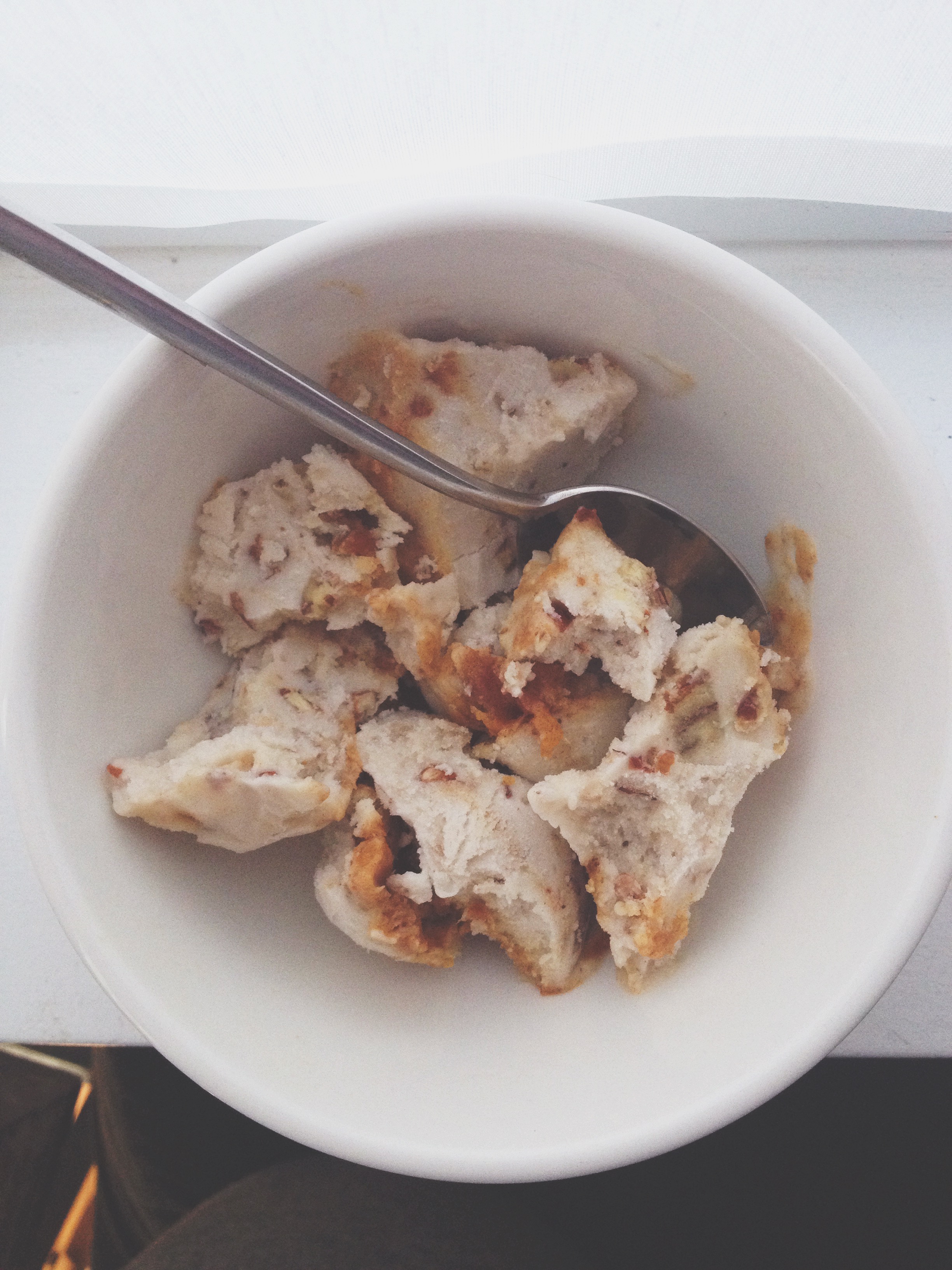 Place half the banana, coconut milk + agave in the blender and whizz it around. while it’s running add the xanthan gum and keep blending until very creamy. dice the other half of the banana and fold into mixture with pecans. place in the ice cream maker (follow the instructions for your machine)! when it’s done, gently fold in the caramel so that there are streaks of (not just mixed in) and place in a container to put in the freezer and let it set up.